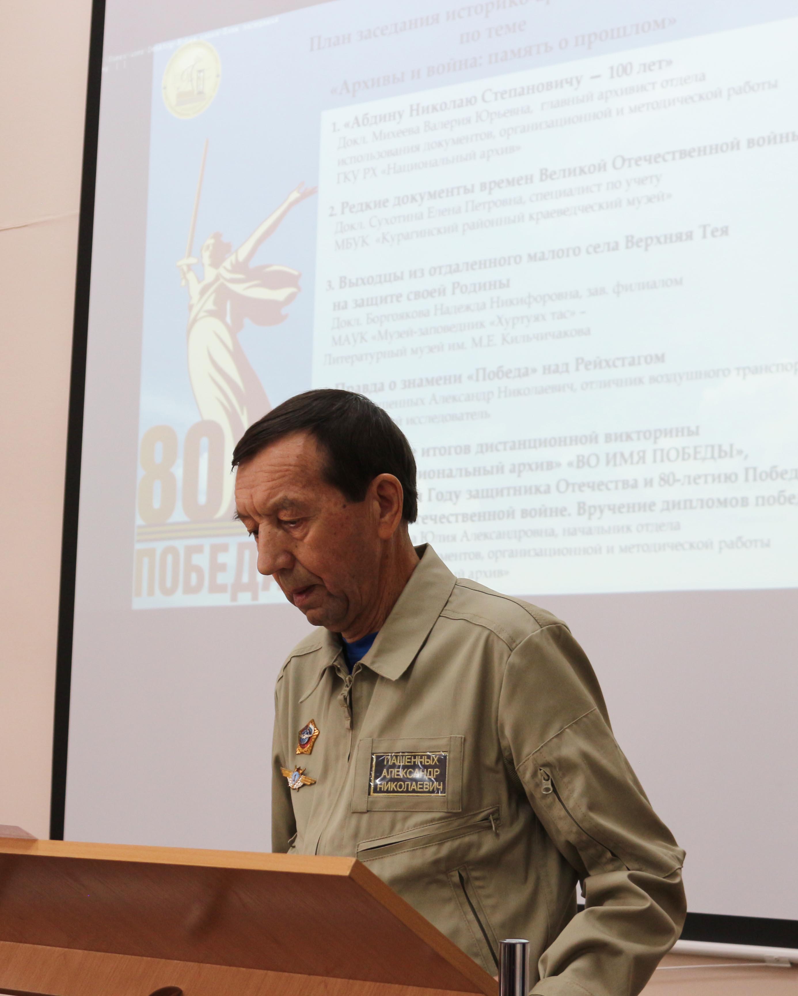 Вступивший в ряды членов клуба Александр Николаевич Пашенных, отличник воздушного транспорта России, также представил свой доклад «Правда о знамени «Победа» над Рейхстагом». В рамках празднования юбилея видного общественного деятеля Хакасии архивисты продемонстрировали свой видеовыпуск «Абдину Николаю Степановичу – 100 лет». Особенно приятно, что на мероприятии присутствовали его близкие родственники.