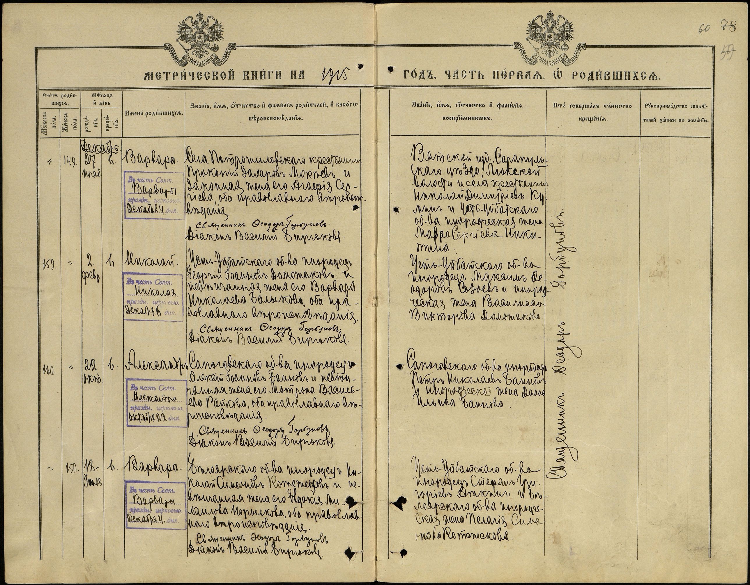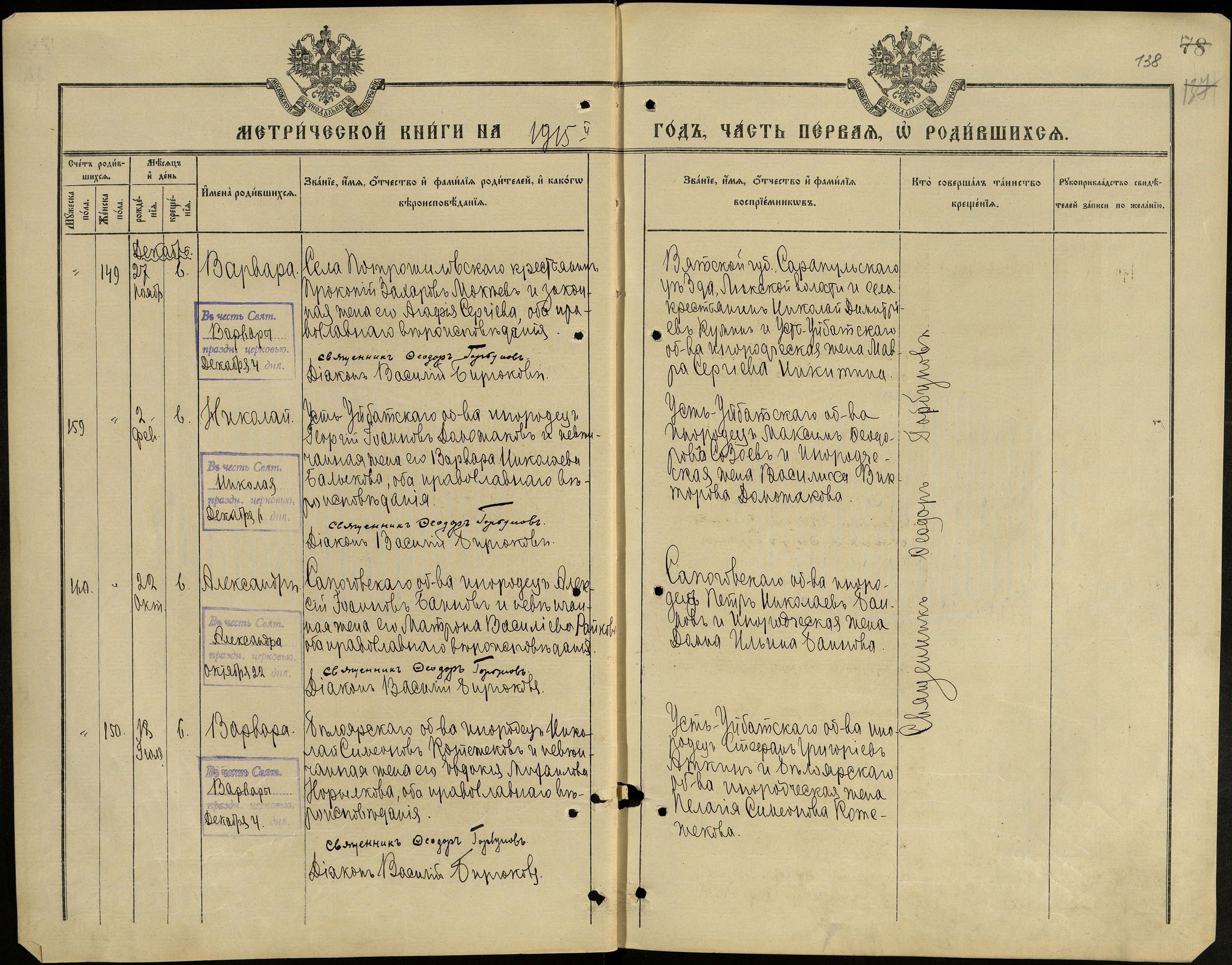 Печати: в метрической записи № 159 в графе «Имена родившихся» имеется оттиск штампа с рукописным указанием имени Святого Николая в честь кого назван родившийся и дата почитания его (Святого Николая) церковью.